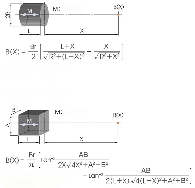 Note: The formulas above are applicable only to permanent magnets with linear demagnetization curves—such as NdFeB, SmCo, and ferrite magnets. They are not suitable for calculating surface magnetic flux density in magnets with non-linear demagnetization curves—such as AlNiCo, FeCrCo, and various soft magnetic materials. Furthermore, this method is inapplicable to magnets with skewed orientation, where the direction of magnetization is not perpendicular to the plane of the magnetic poles.