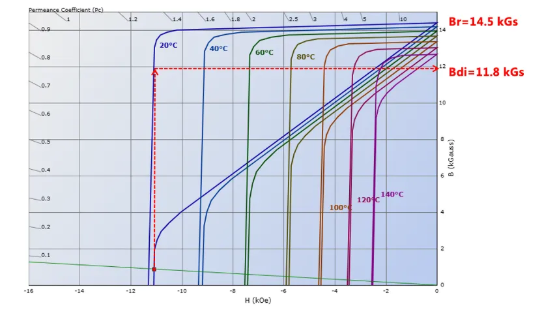 1. First and foremost, the operating point must be situated *above* the knee point of the B-H demagnetization curve, while maintaining an adequate safety margin. Particular attention should be paid to N-grade materials with a maximum energy product exceeding 45 MGOe, as well as thin magnets with a *Pc* value of less than 0.6. If the operating point falls *below* the knee point, the magnetic properties become unstable; even if one attempts to estimate the central surface flux density by extrapolating *Bdi* from the curve, the resulting fluctuations will be significant. Consequently, it becomes necessary to increase the intrinsic coercivity (*Hcj*) to ensure the operating point remains above the knee point—or, ideally, to ensure that the B-H curve exhibits no knee point whatsoever.