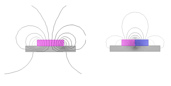 Why does the attractive force of a magnet of a given volume change so drastically when subjected to multi-pole magnetization? The reason lies in the fact that while the contact surface area (S) remains constant, the magnetic flux density (B) passing through the object being attracted increases significantly. As illustrated by the accompanying magnetic field line diagrams, the density of the field lines passing through the iron plate is markedly higher in a multi-pole magnetized magnet. Taking the N35 D10×6 magnet as an example once again: when configured with bi-polar magnetization, FEA simulations indicate that the attractive force exerted on an iron plate is approximately 1,100 times the magnet's own weight.