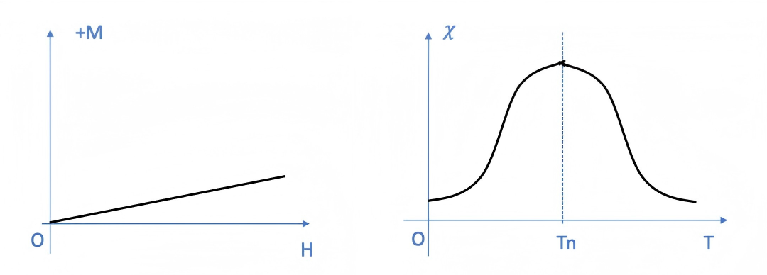 In antiferromagnetic materials, atoms also possess intrinsic atomic magnetic moments. While some electrons become delocalized, the magnetic moments of adjacent atoms align in opposite directions (a phenomenon known as antiferromagnetic ordering). The M–H magnetization curve for antiferromagnetic materials is linear, and their magnetic susceptibility (χ) is positive. The value of χ is typically very small—approximately 10⁻⁴ to 10⁻⁵—and remains constant. This implies that when an antiferromagnetic material is subjected to an external magnetic field, the response of its atomic magnetic moments to the field is minimal; in this regard—and like paramagnetic materials—they are classified as weakly magnetic substances. Furthermore, the magnetic susceptibility (χ) of antiferromagnetic materials varies with temperature, as illustrated in the figure below; the temperature denoted as Tₙis referred to as the Néel temperature.