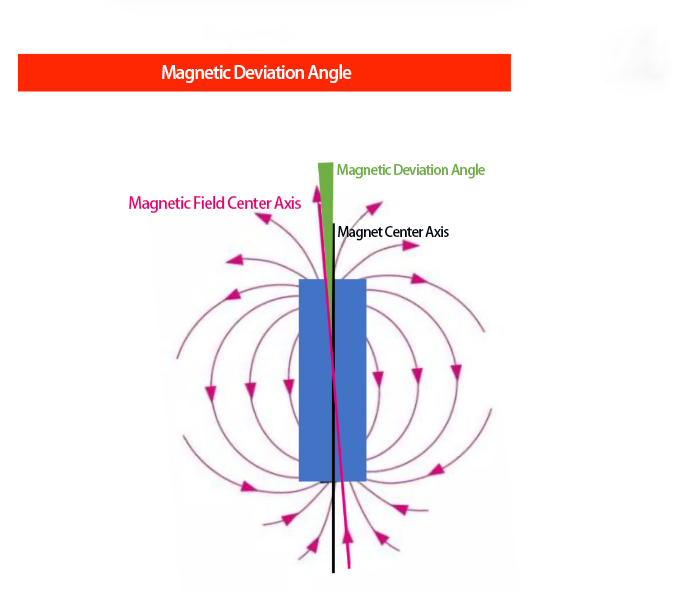Magnetic deviation angle refers to the angle between the direction of the magnetic flux lines and the magnet’s orientation plane. Ideally, this angle is perpendicular to the orientation plane. However, during post-processing—such as bonding and cutting—process variations may create a slight angle between the cutting direction and the pole surface. After magnetization, this can result in reduced magnetic field strength on the orientation surface compared to the expected level.