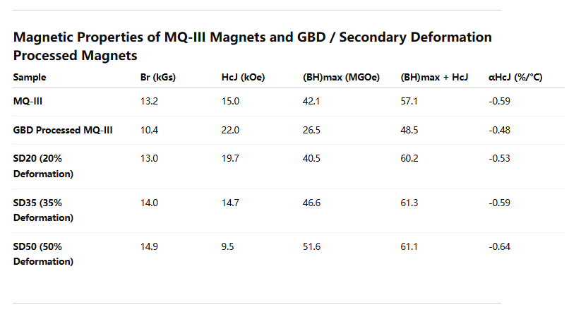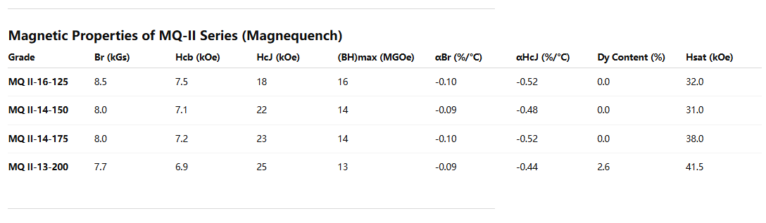 Since the temperatures involved in hot pressing and hot deformation are relatively low, and the duration of the process is brief, the fine-grained (nano- or sub-micron) structure of the rapidly quenched NdFeB magnetic powder is largely preserved. Consequently, MQ-II and MQ-III magnets retain a very high intrinsic coercivity (*HcJ*); notably, the *HcJ* of MQ-II magnets is only 1 to 2 kOe lower than that of the original powder. For a considerable period thereafter, GM continued to manufacture MQ-II and MQ-III magnets. However, in the early 21st century, GM relocated the production of rapidly quenched NdFeB magnetic powder to Tianjin; shortly after the MQ-II and MQ-III magnet production lines were transferred to Mexico, they were discontinued.