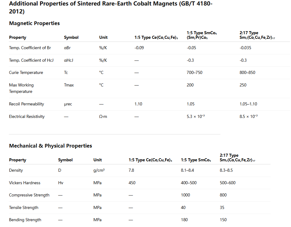 The national standards for the auxiliary electromagnetic properties and selected mechanical and physical properties of sintered rare-earth cobalt permanent magnet materials are as follows: