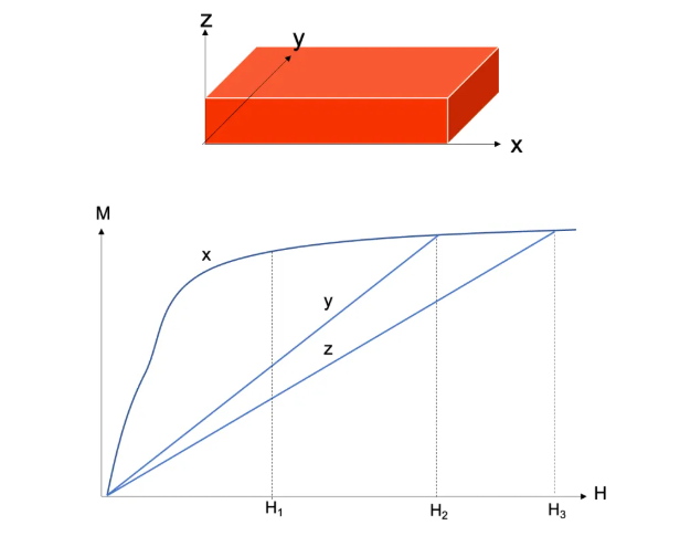 When permanent magnets are fabricated into specific shapes—taking the block-shaped magnet illustrated below as an example—measurements of the open-circuit magnetization curves along the x, y, and z axes reveal a distinct phenomenon: magnetization along the x-direction requires only a relatively low magnetic field (H1) to reach technical saturation, whereas measurements along the y- and z-directions require significantly stronger magnetic fields to achieve the same level of saturation. This phenomenon is termed *shape anisotropy* in permanent magnets. The direction requiring the lowest magnetic field to reach technical saturation is designated the *easy axis of magnetization*, while the direction requiring the highest magnetic field to reach technical saturation is designated the *hard axis of magnetization*.