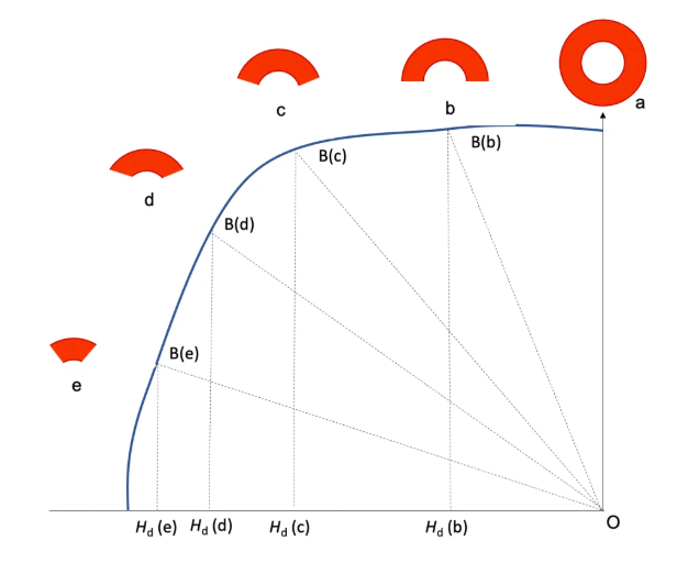 The intensity of a permanent magnet's demagnetizing field is contingent upon the magnet's specific shape and dimensions. Consider, for instance, a ring-shaped permanent magnet: the intensity of its demagnetizing field varies in accordance with the size of the gap in the ring (which effectively corresponds to the magnet's length). When such a ring-shaped magnet is magnetized along the direction of its central axis, no demagnetizing field is generated. However, if the ring-shaped magnet is severed in half, the resulting semi-circular segment will possess a demagnetizing field denoted as Hd. Furthermore, as the ring-shaped magnet is cut into progressively shorter segments, the absolute magnitude of its demagnetizing field (Hd) increases correspondingly. The sequence of this gradual increase in the absolute magnitude of the demagnetizing field can be expressed as: Hd (e) > Hd (d) > Hd (c) > Hd (b) > Hd (a) → 0.