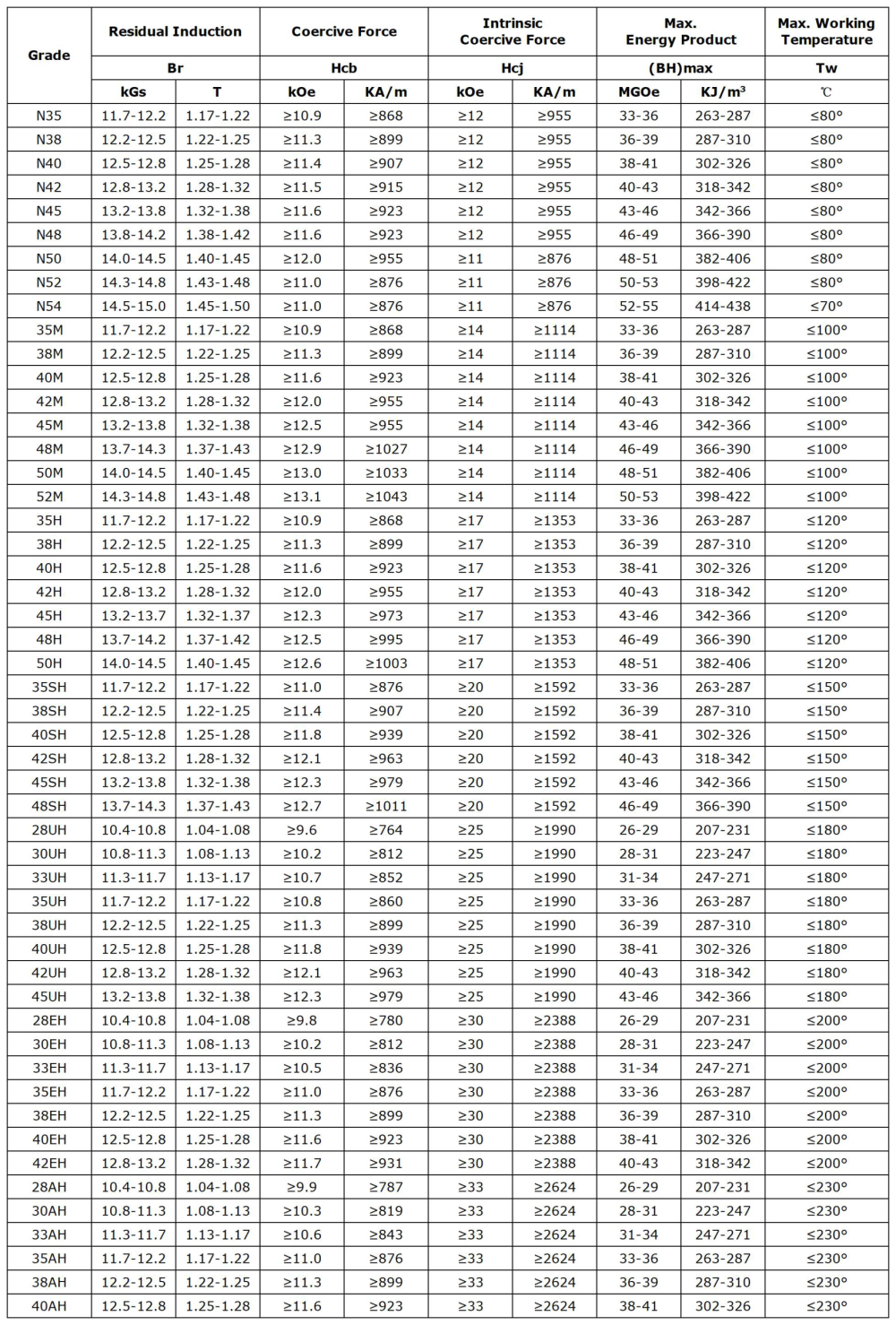 The properties of sintered NdFeB magnets under each grade are not single fixed values, but rather fall within a certain range. These performance ranges may vary among different manufacturers, so it is important to ensure that the supplier’s specifications meet your requirements when making a selection.