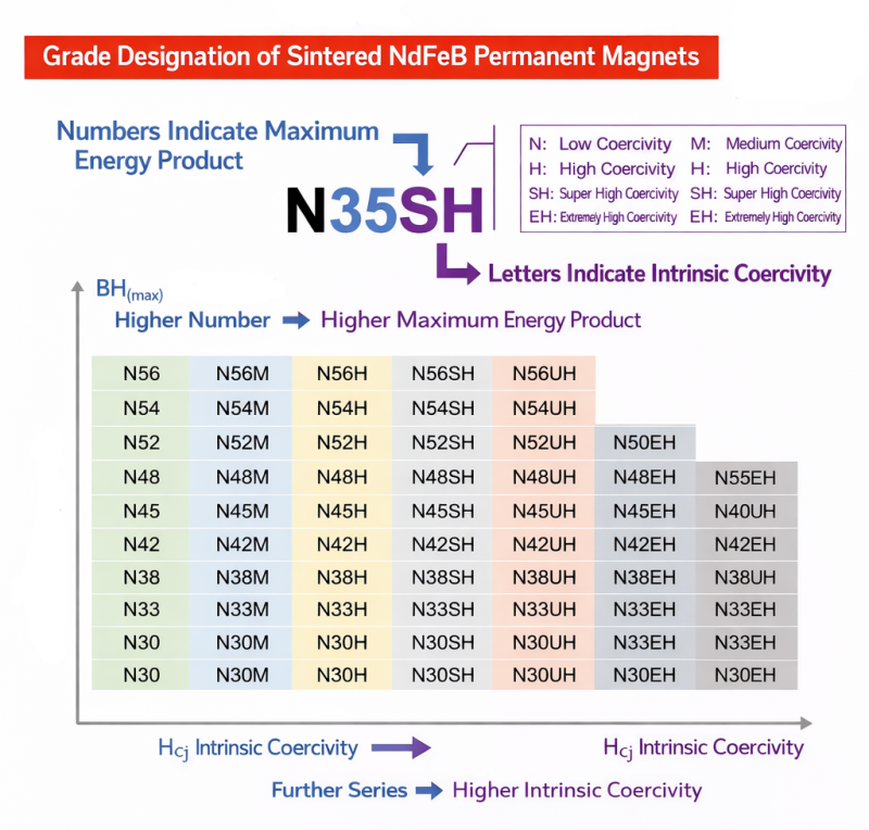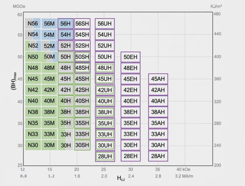 Sintered NdFeB permanent magnets can be classified into seven series based on intrinsic coercivity (HcJ): N, M, H, SH, UH, EH, and AH (TH). Within each series, grades are further subdivided according to remanence (Br) and maximum energy product (BH)max.
