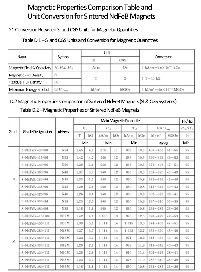 The latest national standard for sintered NdFeB magnets (GB/T 13560-2017), jointly issued by the General Administration of Quality Supervision, Inspection and Quarantine and the Standardization Administration of China, came into effect in May 2018. It specifies the minimum values or ranges of performance parameters for different grades of sintered NdFeB magnets, as shown in the figure below.