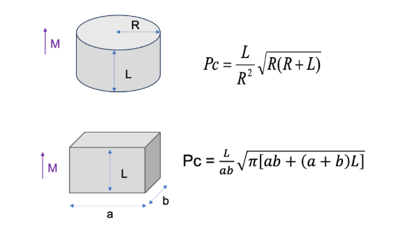 The demagnetization factor N is closely tied to the magnet's geometry; consequently, the value of Pc depends on the magnet's shape and dimensions. For magnets that are more elongated in the direction of magnetization, the demagnetization factor is smaller; conversely, for magnets that are flatter in the direction of magnetization, the demagnetization factor is larger. The value of N falls within the range 0 < N < 1 or 0 < N < 4π.