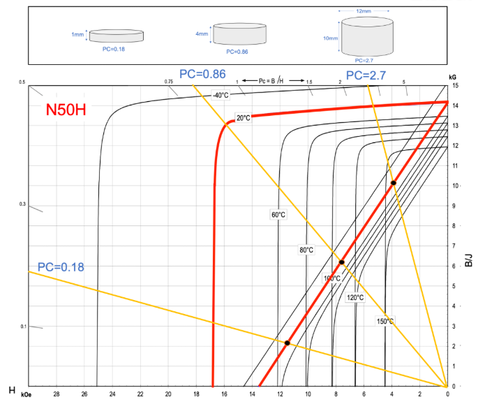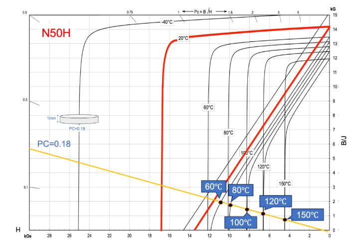 If a magnet's Pc value is low—meaning its operating point falls below the knee of the demagnetization curve—the magnet cannot function normally at the corresponding temperature. As illustrated in the figure below, an N50H-grade magnet (D12 × 1 mm) operating in an environment exceeding 60°C will experience severe, irreversible demagnetization; consequently, it is necessary to either adjust the magnet's dimensions or upgrade to a higher coercivity grade.