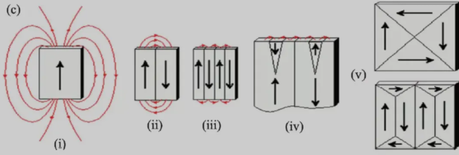 The formation of magnetic domains can be simply understood as a mechanism to reduce the magnetic dipole energy—specifically, the demagnetization energy—associated with the stray fields that permeate the surrounding external space. Figure c-i illustrates a single-domain magnet, characterized by a widely distributed stray field; to attenuate this field, the magnetic moments within the material spontaneously undergo a redistribution, thereby forming magnetic domains. The most intuitive form of this redistribution is depicted in Figure c-ii, where two distinct domains—an upper and a lower one—are formed, resulting in a substantial reduction of the stray field. If this process continues to form four domains—as shown in Figure c-iii—the stray field is attenuated even further. However, this process simultaneously leads to an increase in magnetostatic exchange energy, which can be broadly conceptualized as domain wall energy. The final morphology and scale of the magnetic domains represent the outcome of a competition between the magnetic dipole energy and the exchange energy. Furthermore, if the size or external geometry of the ferromagnetic sample is altered, the resulting magnetic domain structures can exhibit a rich variety of forms—such as the domain configuration illustrated in Figure c-v.