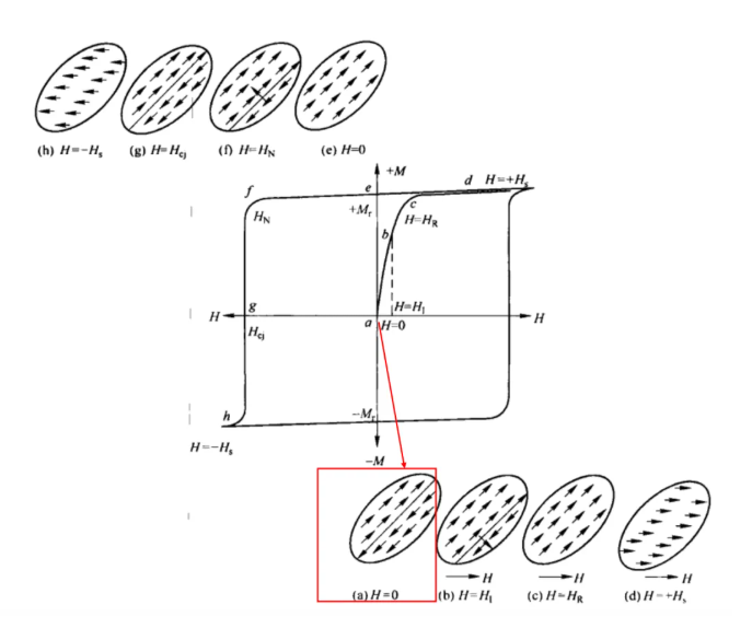 When the magnetic field is zero, the number of atomic magnetic moments in the upper domain is equal to that in the lower domain, and their directions are opposed; consequently, the vector sum of the atomic magnetic moments is zero, and the magnetization of the material is zero. This is illustrated in Figure (a).