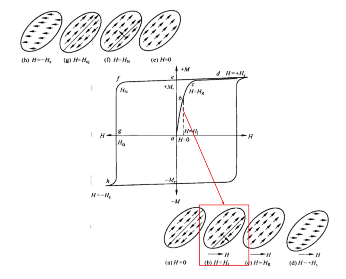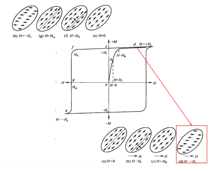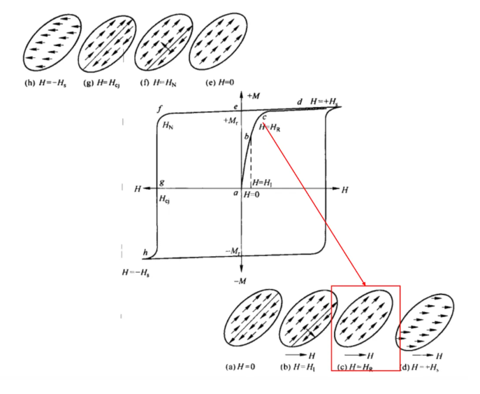 As the external magnetic field gradually increases from point HR to point HS—that is, from point c to point d—the atomic magnetic moments progressively rotate to align with the direction of the external field, as illustrated in Figure (d). When the external magnetic field reaches point HS, virtually all atomic magnetic moments have rotated to a direction parallel to the field; at this juncture, the magnetic material has attained a state of technical magnetization saturation, and the corresponding magnetization intensity is termed the saturation magnetization. The process of technical magnetization is fundamentally realized through two mechanisms: domain wall displacement and the rotation of magnetic moments.