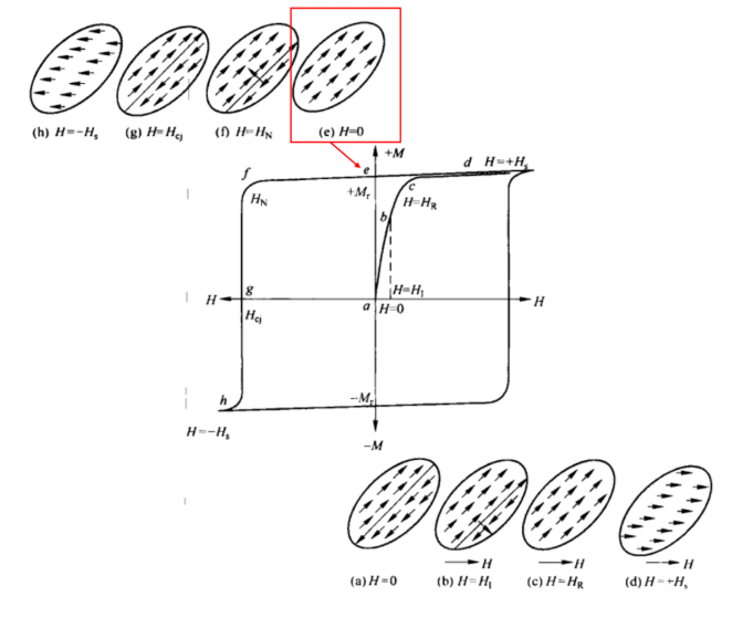 If the external magnetic field is reduced to zero, the atomic magnetic moments will gradually align themselves along the direction of the major axis, as shown in Figure (e); this process constitutes the rotation of the magnetic moments. It is evident that, even after the external magnetic field is removed, the magnetization does not decrease to zero; rather, a value of *M*r is retained in the positive direction of the magnetic field—a quantity known as the *residual magnetization*.
